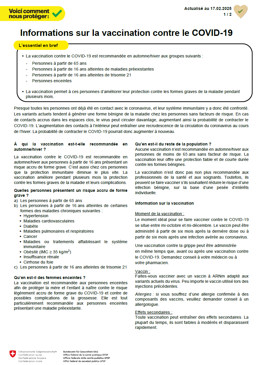 De février 2020 à mars 2022, l’OFSP et ses partenaires ont informé la population de la situation épidémiologique et des recommandations de conduite à observer à l’aide d’une campagne déclinée en 45 volets et d’une offensive en faveur de la vaccination. Entre avril 2022 et novembre 2023, l’OFSP a encadré le passage de la phase pandémique à la phase endémique à l’aide de trois autres volets de campagne. Il a mis régulièrement à jour le site Internet de la campagne COVID-19, répondu aux demandes des médias et mis à disposition des supports de communication. Enfin, il a lancé en novembre 2023 une campagne combinant la vaccination contre la grippe avec celle contre le COVID‑19 pour le groupe cible des personnes vulnérables. À partir de 2024, la communication en lien avec le COVID‑19 a été intégrée à la Stratégie nationale de vaccination (SNV).