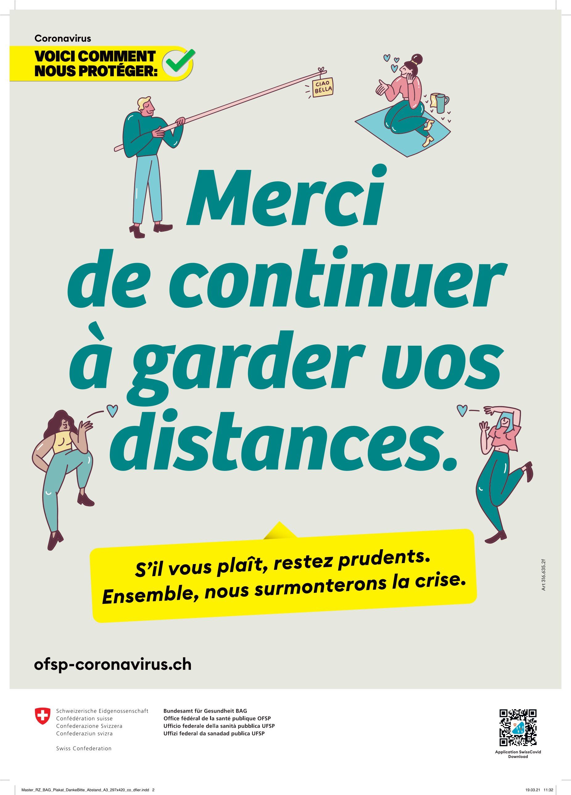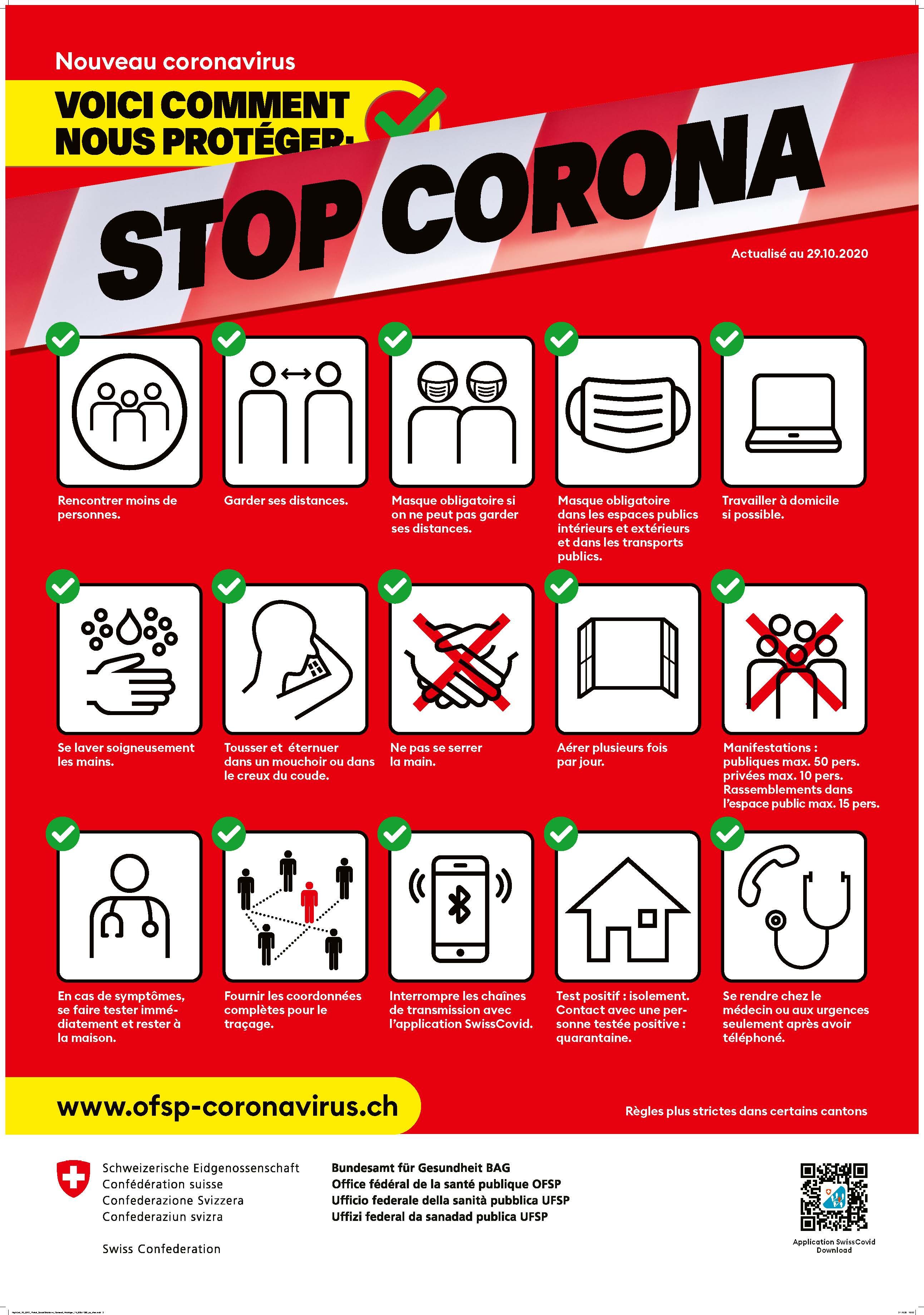 La campagne COVID-19 reposait sur un système de couleurs de signalisation modulable, qui permettait de transmettre de nouveaux messages ou de nouveaux éléments lorsque c’était nécessaire, tout en assurant une continuité visuelle. Ce système permettait, sur le modèle des feux tricolores, d’adapter visuellement la communication à l’évolution de la situation et de signaler son aggravation ou son amélioration. Toutes les mesures de communication comportaient une date informant du moment de publication et un lien vers la plateforme d’informations www.bag-coronavirus.ch pour les personnes souhaitant approfondir leurs connaissances. Enfin, le logo d’émettrice du message soulignant le caractère officiel des outils publicitaires et, partant, la crédibilité et la fiabilité des informations, il fournissait une orientation claire.