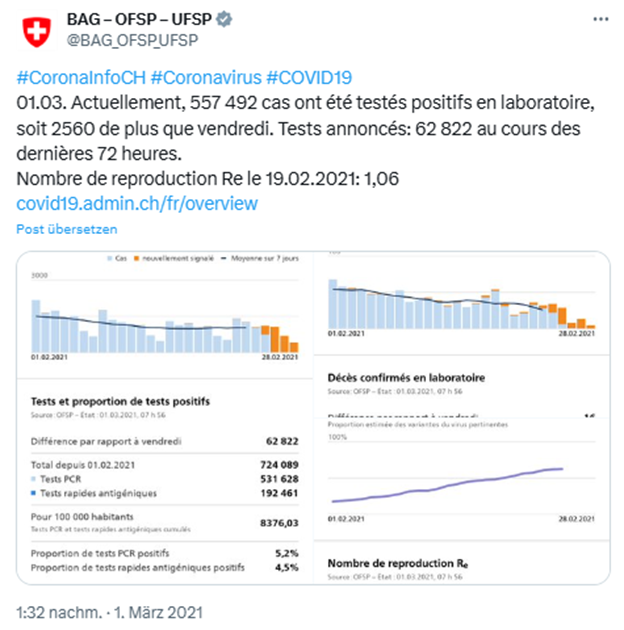 La pandémie de COVID-19 a mis en lumière toute l’importance de disposer d’informations claires et rapides. Tant le Conseil fédéral que les offices fédéraux impliqués ont utilisé les médias sociaux pour diffuser des mises à jour quotidiennes. En parallèle, de nombreux cantons et villes ont publié les mesures et les offres de soutien locales dans des lettres d’information. Les exemples ci-après montrent comment une communication efficace est gage de confiance en temps de crise et soutient la population.